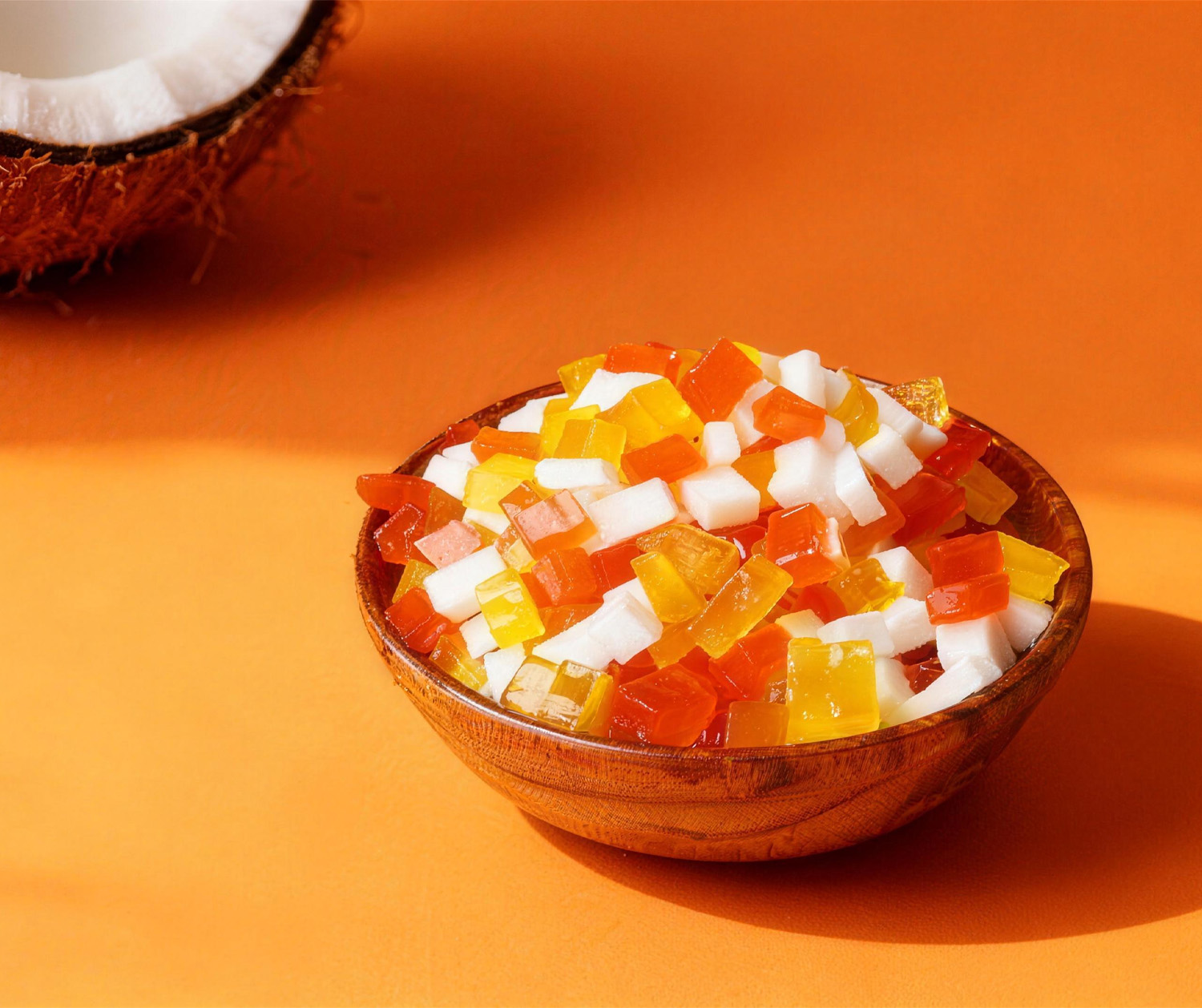 Our Rainbow Coconut Jelly features vibrant, assorted colors and a soft, chewy texture. Made with coconut essence, it has a mild sweet taste that pairs well with a variety of drinks.